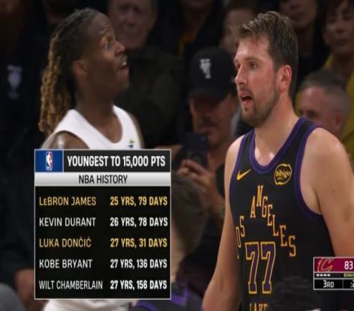 27歲31天的東契奇超越了科比的27歲136天拿到15000分,成為NBA歷史上第三年輕的15000分先生,僅次于詹姆斯(25歲79天)和杜蘭特(26歲78天)。