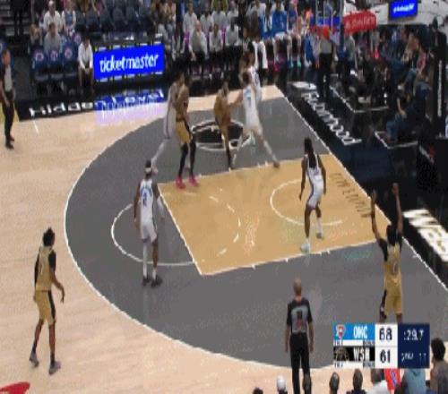半場結(jié)束前26秒,奇才一個(gè)普通的進(jìn)攻得手。杰林威拿球底線發(fā)球。