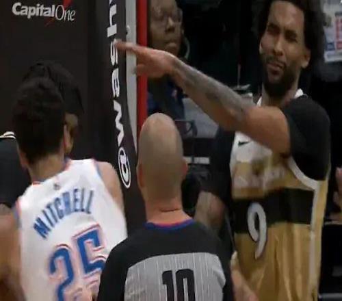 也不知道杰林威想干嘛,拿著球就和站在底線的尚帕尼玩起了頂牛推搡,裁判見狀迅速分開了兩人。
