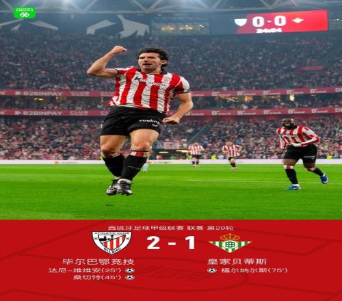 北京時(shí)間3月23日西班牙足球甲級聯(lián)賽 聯(lián)賽 第29輪,畢爾巴鄂競技主場對陣皇家貝蒂斯。畢爾巴鄂競技達(dá)尼-維維安破門,桑切特破門?;始邑惖偎垢柤{爾斯破門。最終比分畢爾巴鄂競技 2-1 皇家貝蒂斯。