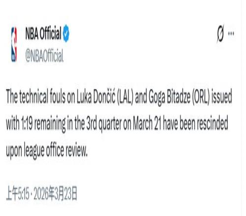 NBA官方:東契奇比塔澤技犯被撤銷(xiāo)盧卡對(duì)陣活塞將不會(huì)被禁賽