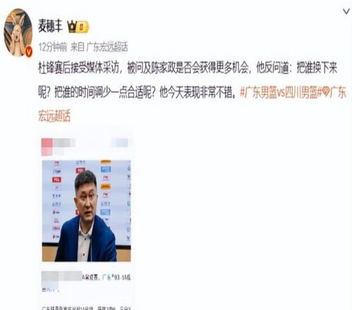 就在所有人都以為,這場封神表現(xiàn)能讓陳家政在廣東男籃獲得更多出場機會時,主教練杜鋒的賽后采訪,卻給所有人澆了一盆冷水。