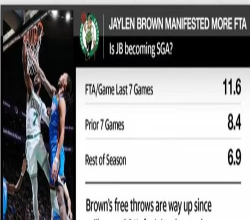 有點意思!數(shù)據(jù)瘋漲,布朗近7戰(zhàn)場均11.6次罰球,吐槽果然有用啊