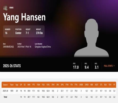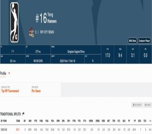 此外,楊瀚森還代表混音出戰(zhàn)了5場Tip-Off Tournament(G聯(lián)賽賽季初的錦標(biāo)賽階段,區(qū)別于后續(xù)的常規(guī)賽),場均登場30.9分鐘得到16.2分9.4籃板(2前場籃板+7.4后場籃板)3.6助攻0.4搶斷1.2蓋帽,投籃命中率50.6%,三分球命中率31.3%,罰球命中率72.7%。