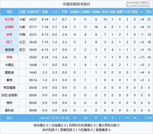 火箭:杜蘭特25分6板10助、史密斯21分16板4助、阿門18分8板3助2斷、伊森16分7板1助、謝潑德15分5板5助4斷、申京14分8板7助2帽、霍勒迪6分1板、卡佩拉2分5板2帽、泰特2分1板