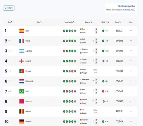 目前在FIFA官網(wǎng)實時排名統(tǒng)計中,阿根廷僅收獲0.63分,積分降至第三被法國超過。