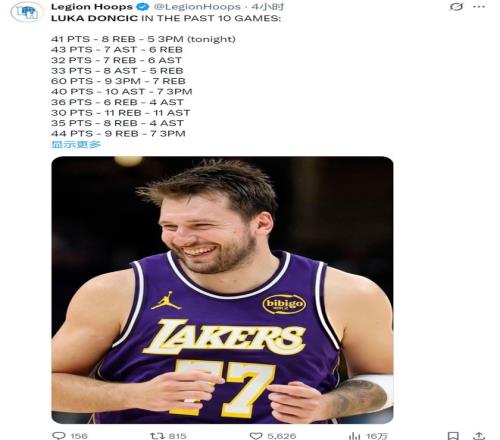 東契奇今天又炸了。25投15中,三分10中5,41分8籃板3助攻3搶斷。湖人116-99輕取籃網(wǎng),最近12場贏了11場。他連續(xù)12場30+,隊史第四,跟貝勒、韋斯特、科比坐一桌。