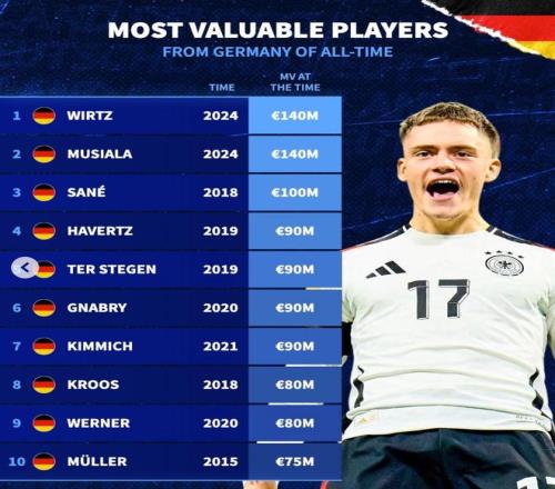 德轉(zhuǎn)德國球員歷史身價榜:維爾茨、穆西亞拉1.4億歐第1