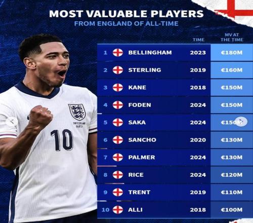 德轉(zhuǎn)英格蘭球員歷史身價(jià)榜:貝林1.8億歐第1,斯特林1.6億第2