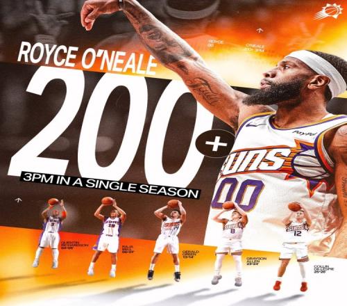 據(jù)太陽官方統(tǒng)計,這是奧尼爾賽季第200記三分,是隊史第六個達到這一成就的球員。