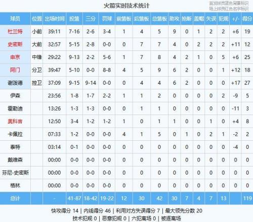 謝潑德27分4板6助2斷、申京25分8板4助2斷、杜蘭特19分5板9助、阿門18分9板6助2斷、史密斯12分7板4助2帽、奧科吉8分1板1助、伊森5分2板