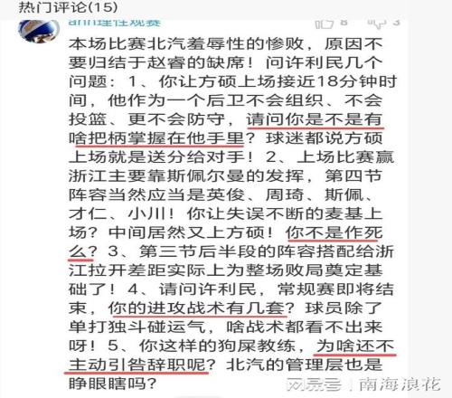 北京球迷更是眾口一詞對準(zhǔn)許利民,嚴(yán)重質(zhì)疑他的臨場指揮,直接四問許利民:1、你讓方碩上場接近18分鐘時(shí)間,他作為一個(gè)后衛(wèi)不會組織、不會投籃、更不會防守,請問你是不是有啥把柄掌握在他手里?2、上一回合贏浙江主要靠斯佩爾曼的發(fā)揮,第四節(jié)陣容當(dāng)然應(yīng)當(dāng)是英俊、周琦、斯佩、才仁、小川!你今天讓失誤不斷的麥基上場?中間居然又上方碩!你不是作死么?3、請問許利民,常規(guī)賽即將結(jié)束,你的進(jìn)攻戰(zhàn)術(shù)有幾套?球員除了單打獨(dú)斗碰運(yùn)氣,啥戰(zhàn)術(shù)都看不出來呀!4、你這樣的GS教練,為啥還不主動引咎辭職呢?北汽的管理層也是:睜眼瞎嗎?