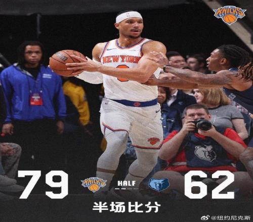 次節(jié)比賽,雙方連續(xù)兩節(jié)單節(jié)得分30+,繼續(xù)展開對攻模式對決。尼克斯保持高效進(jìn)攻效率,前兩節(jié)比賽尼克斯41中29,其中三分10中7,均是達(dá)到7成準(zhǔn)星,全隊(duì)已經(jīng)3人得分上雙,唐斯13+7+5、布里奇斯17分與沙梅特10分?;倚苋?0中9,克萊頓與杰克遜均是10分,上半場結(jié)束尼克斯79-62領(lǐng)先灰熊。