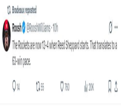 休媒Roosh寫道,本賽季謝潑德先發(fā)時(shí)火箭13勝4負(fù),換言之火箭隊(duì)本有希望拿到63勝。(除此之外謝潑德拿到20分的比賽有12場火箭拿到9勝3負(fù),火箭也有62勝)