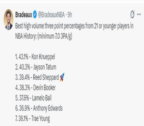 5.21歲及以下場均出手至少7次三分的球員里,謝潑德命中率39.4%排歷史第三;
