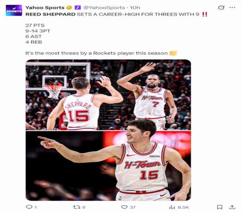 2.謝潑德單場9個(gè)三分是本賽季火箭球員最多;