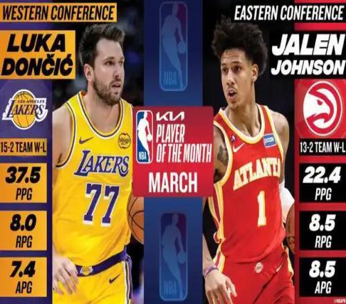北京時間3日凌晨,NBA官方宣布,湖人的東契奇和老鷹的杰倫-約翰遜分別當(dāng)選三月份西部和東部聯(lián)盟月度最佳球員。