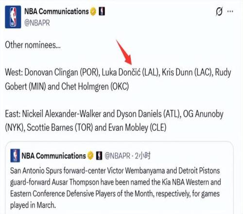 北京時間4月3日,洛杉磯湖人隊后衛(wèi)盧卡-東契奇當選NBA三月西部月最佳球員。這是他本賽季第二次、職業(yè)生涯第七次獲得該月度榮譽。