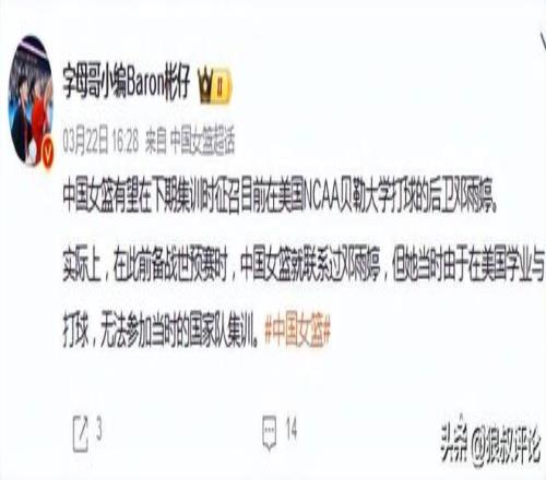 中國女籃方面,有媒體人報(bào)道,她有望在下期集訓(xùn)時(shí)征召目前在美國NCAA貝勒大學(xué)打球的后衛(wèi)鄧雨婷。