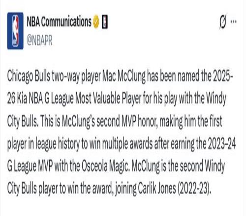 三屆扣籃王獲新榮譽(yù)!麥克朗再次當(dāng)選G聯(lián)賽MVP此前成歷史得分王