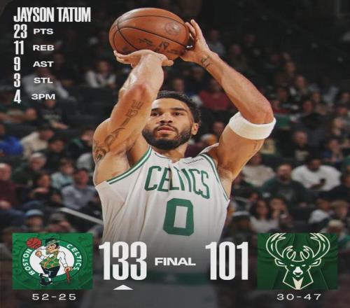 北京時間4月4日,NBA常規(guī)賽:雄鹿101-133慘敗給凱爾特人。最近三次交手,凱爾特人一共贏了雄鹿89分。塔圖姆16中8得到23分11板9助3斷2失誤,正負值+30!杰倫-布朗17中7得到26分3板4助2斷2失誤,正負值+27。