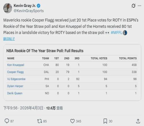 ESPN邀請(qǐng)100位體育媒體人,模擬最佳新秀投票??四崤鍫柕玫?0張第一選票,弗拉格得到20張第一選票!談到最佳新秀之爭,今天賽后弗拉格表示:“希望這場51分有所幫助,但我不會(huì)為此擔(dān)心,我只專注于每晚讓自己變得更好?!?/p>