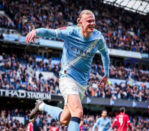 4月4日,足總杯1/4決賽,曼城vs利物浦。利物浦場面占優(yōu),但薩拉赫丟單刀,?;倏私舆B錯失機會。第37分鐘,范戴克防守過于冒失送上點球,哈蘭德一蹴而就,連續(xù)4個主場攻破利物浦大門,成為近9年來曼城第1人。短短8分鐘,哈蘭德上演梅開二度好戲。
