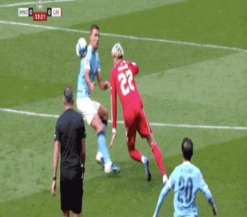 第36分鐘,努內(nèi)斯禁區(qū)內(nèi)傳球,范迪克如同伐木一般放倒了奧萊利,奧利弗迅速將手指向點(diǎn)球點(diǎn)。