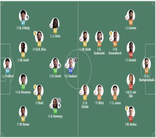 曼城(433):1-特拉福德;27-努內(nèi)斯,45-胡桑諾夫,15-格伊,33-奧賴?yán)?6-羅德里(62’14-尼科-岡薩雷斯),20-B席;42-塞梅尼奧(71’47-福登),10-謝爾基(71’4-賴因德斯),11-多庫(kù)(62’26-薩維尼奧);9-哈蘭德(77’7-馬爾穆什)