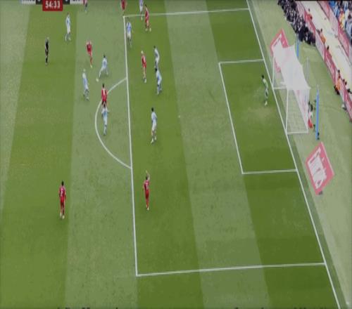 第57分鐘,奧賴?yán)智蛑罄^續(xù)前插,多庫(kù)直塞,奧賴?yán)麉^(qū)左側(cè)倒三角傳球,哈蘭德左腳推射空門得手,上演帽子戲法,4-0!