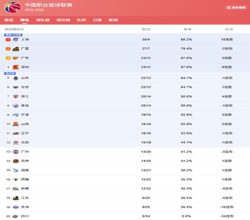 在第3爭奪戰(zhàn)中,山東和北京隊表現(xiàn)都有些下滑,他們也被拉開差距,落后廣東、深圳1場勝負差,同為22勝12負,爭奪第5的位置!