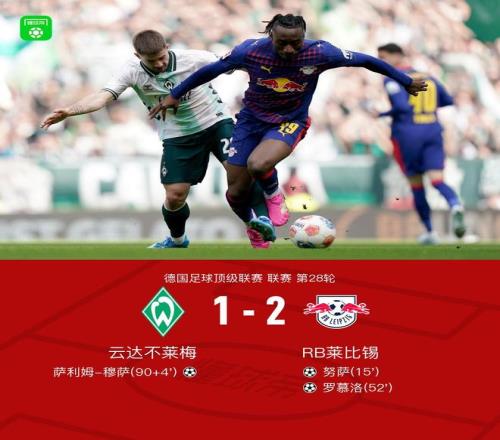 北京時(shí)間4月4日德國(guó)足球頂級(jí)聯(lián)賽第28輪,云達(dá)不萊梅主場(chǎng)對(duì)陣RB萊比錫。。努薩、羅慕洛分別破門。薩利姆-穆薩扳回一城。最終比分云達(dá)不萊梅1-2RB萊比錫。