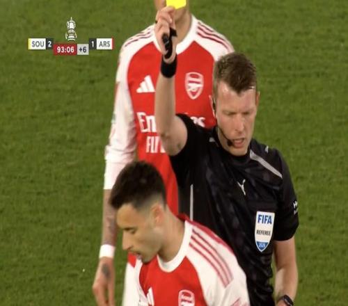 足總杯1/4決賽,阿森納客場對陣南安普頓,阿森納邊鋒馬丁內(nèi)利在尾聲階段因推搡主裁被出示黃牌。