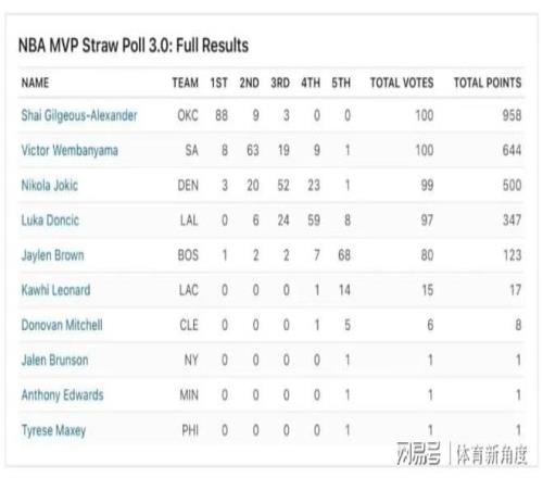 而被廣大球迷寄予厚望的文班亞馬,在此次模擬投票中,僅僅獲得了8張第一選票,還不到亞歷山大的十分之一。此外,還有一點(diǎn)需要特別留意,由于MVP的最終歸屬是由記者投票決定的,因此ESPN所公布的榜單相較于NBA官方數(shù)據(jù)而言,更具權(quán)威性。NBA官方主要是依據(jù)球員在賽場預(yù)測,而ESPN則是直接統(tǒng)計(jì)那些擁有投票資格的記者的選票意向,其數(shù)據(jù)更能。