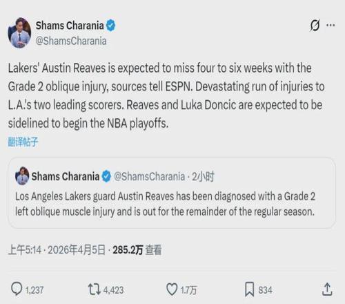 北京時間4月5日凌晨,據(jù)NBA名記Shams報道,湖人后衛(wèi)奧斯汀-里夫斯因二級腹斜肌拉傷,將缺席4到6周。里夫斯跟東契奇一樣,不僅常規(guī)賽報銷,也將缺席季后賽首輪。本賽季東契奇和里夫斯場均合砍57分,占全隊得分48.9%。
