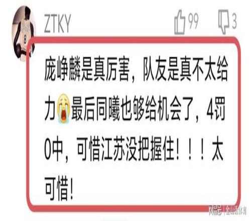 真的替“老六”惋惜啊。本場比賽,龐崢麟一人扛著球隊(duì)往前走,表現(xiàn)得足夠出色和給力。此役龐崢麟出戰(zhàn)35分鐘,全場18投12中,三分6中3、罰球6中4,得到31分5籃板8助攻的全面數(shù)據(jù)。上半場在比分落后時(shí),正是龐崢麟一次次外投內(nèi)突,才沒讓比分拉開。下半場關(guān)鍵時(shí)刻,又是龐崢麟強(qiáng)突2+1,再次追平比分。但是很無奈,由于隊(duì)友缺少足夠的火力支持,龐崢麟的31分5籃板8助攻,依然不能換來勝利。