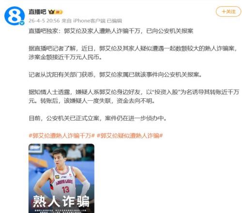 國內(nèi)知名籃球平臺報道:郭艾倫及其家人,被熟人詐騙千萬......