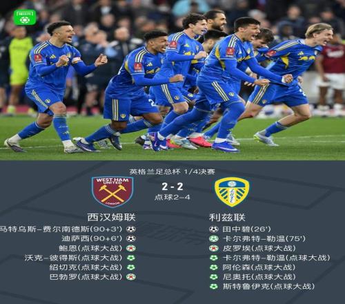 北京時間4月5日23:30,足總杯1/4決賽,西漢姆聯(lián)對陣?yán)澛?lián)。上半場,奧卡福爾推射被門將撲出,鮑恩小角度打門被門將化解,田中碧折射建功打破僵局。下半場,塔蒂頭球攻門擊中立柱,阿倫森禁區(qū)內(nèi)造點,勒溫點射破門,費爾南德斯、迪薩西三分鐘內(nèi)連入兩球扳平比分,加時賽雙方均無建樹。點球大戰(zhàn),西漢姆聯(lián)球員鮑恩和巴勃羅丟點,斯特魯伊克罰進制勝點球,最終,利茲聯(lián)4-2點殺西漢姆聯(lián),總分6-4晉級,利茲聯(lián)時隔39年再次打進英格蘭足總杯四強,半決賽將對陣切爾西。