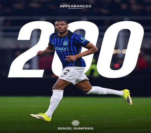 此役是鄧弗里斯為國米出戰(zhàn)的第200場比賽,他總計貢獻25球26助,國米官方社媒曬出海報,祝賀他達成這一里程碑。