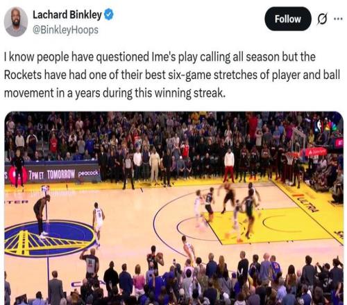 正如賽后火箭記者Lachard Binkley所說(shuō),整個(gè)賽季烏度卡的戰(zhàn)術(shù)水平都被質(zhì)疑,但就6連勝期間的表現(xiàn)來(lái)看,他們正在打出本季最好的跑位和運(yùn)轉(zhuǎn)球。