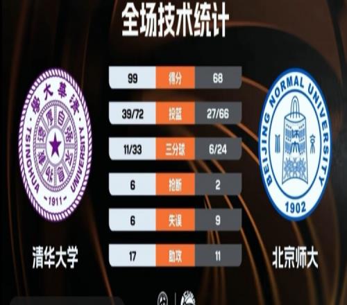 末節(jié)比賽,鄭君豪外線開炮連中三分,北師大連投帶罰苦苦支撐,劉慶聞罰球?qū)⒎植罾_到30分以上,許熙桐連中三分錦上添花,北師大攻防兩端辦法不多,最終,清華大學(xué)99-68大勝北京師大。