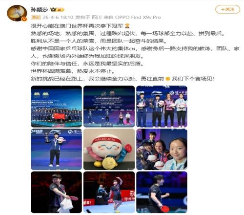 三連冠!孫穎莎社媒:新的挑戰(zhàn)已在路上,會(huì)繼續(xù)全力以赴勇往直前