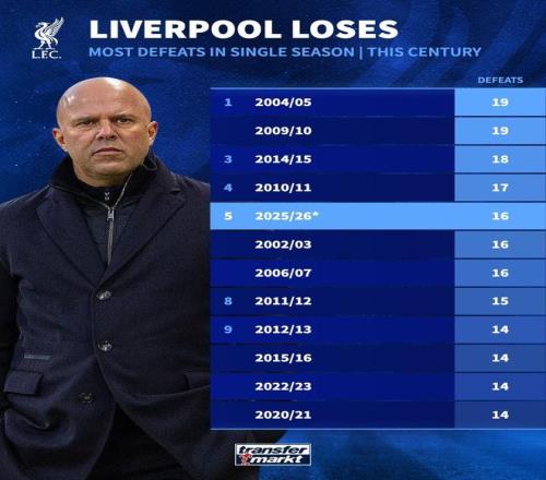 4月6日,德國轉會市場網站列出了利物浦本世紀單賽季輸球場次排行,利物浦本賽季已輸16場(含社區(qū)盾點球大戰(zhàn)告負),位列第五。