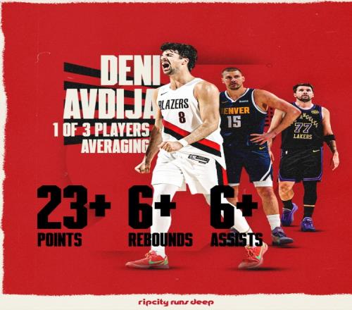 本賽季,阿夫迪亞場均23.9分7籃板6.7助攻;約基奇場均27.9分12.9籃板10.9助攻;東契奇場均33.5分7.7籃板8.3助攻。