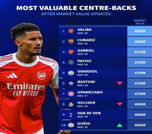 北京時間4月7日,德轉(zhuǎn)列出了目前世界足壇身價排名前10的中后衛(wèi),薩利巴以9000萬歐元排名第一,庫巴西8000萬歐元第二,加布里埃爾7500萬歐元第三。