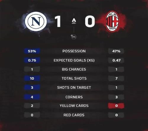下半場補時5分鐘。最終全場比賽結(jié)束,那不勒斯1-0米蘭。