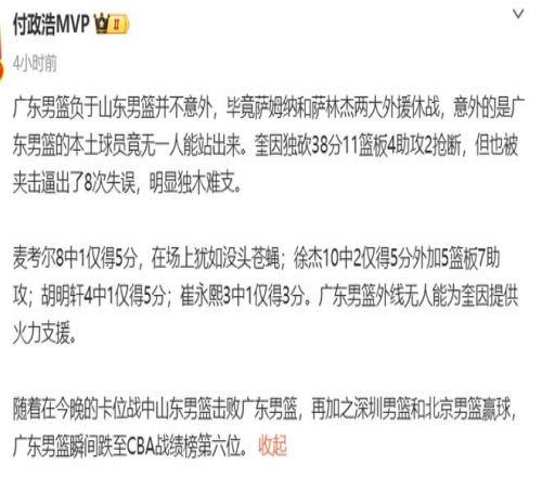 賽后媒體人付政浩談到了這個問題,并且指出了這個致命要害:廣東男籃負于山東男籃并不意外,畢竟薩姆納和薩林杰兩大外援休戰(zhàn),意外的是廣東男籃的本土球員竟無一人能站出來。奎因獨砍38分11籃板4助攻2搶斷,但也被夾擊逼出了8次失誤,明顯獨木難支。