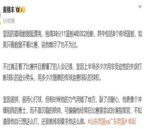 廣東隊輸了山東13分,麥考爾的正負值也恰好是-13,從控制變量法的角度出發(fā),這場麥考爾如果不打,那廣東隊可能有贏的機會,當(dāng)然了,麥考爾打得差不要緊,其實真正要命的是杜鋒仍然意識不到麥考爾的真正問題,還是對他非常信任,老是幻想著麥考爾還能練出來。