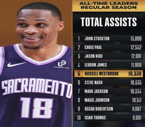 3月18日,聯(lián)盟官宣了一個(gè)硬核消息:威斯布魯克的生涯總助攻正式?jīng)_到了歷史第5。他在對(duì)陣馬刺的那場比賽里,一口氣超了馬克·杰克遜和納什,排名連跳兩級(jí)。