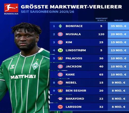 本賽季德甲身價跌幅榜:博尼費斯暴跌3500萬第1,穆西亞拉第2